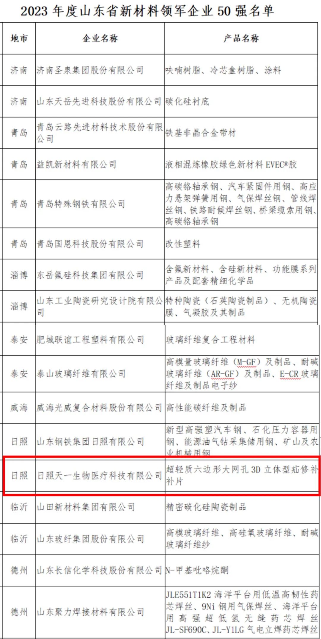日照天平生物当选2023年度山东省新资料领军企业50强